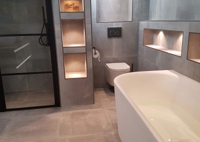 In dat laatste geval leveren we niet alleen het tegelwerk, maar zorgen we ook voor al het timmerwerk, het installatiewerk (elektriciteit, gas, water, afvoer, verwarming) en de afwerking.